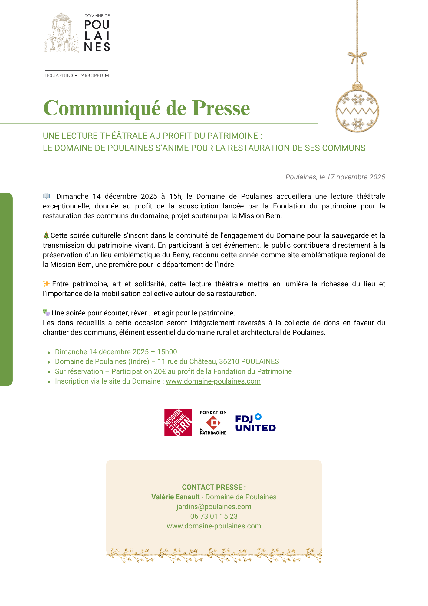 Une lecture théâtrale interprétée par un artiste de la scène nationale, Monsieur André Salzet, sera donnée le dimanche 14 décembre 2025, dans le cadre authentique du Manoir du domaine, offrant au public un moment d’émotion et de partage au profit du patrimoine.