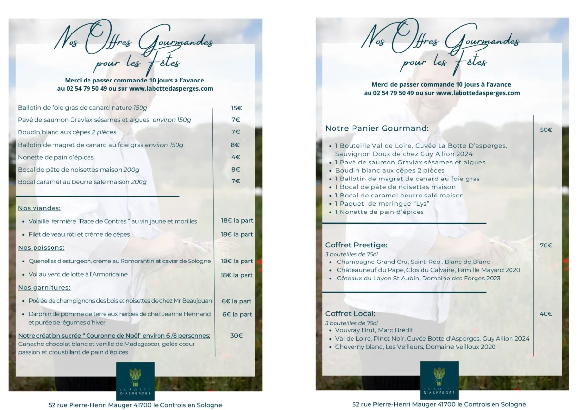 À Contres, le restaurant La Botte d’Asperges vous accueille dans une ambiance intimiste pour un réveillon haut en saveurs. Le Chef Stéphane Bureau, accompagné de sa fille en cuisine et de son épouse Maud en salle, sublime les produits des producteurs et viticulteurs locaux.