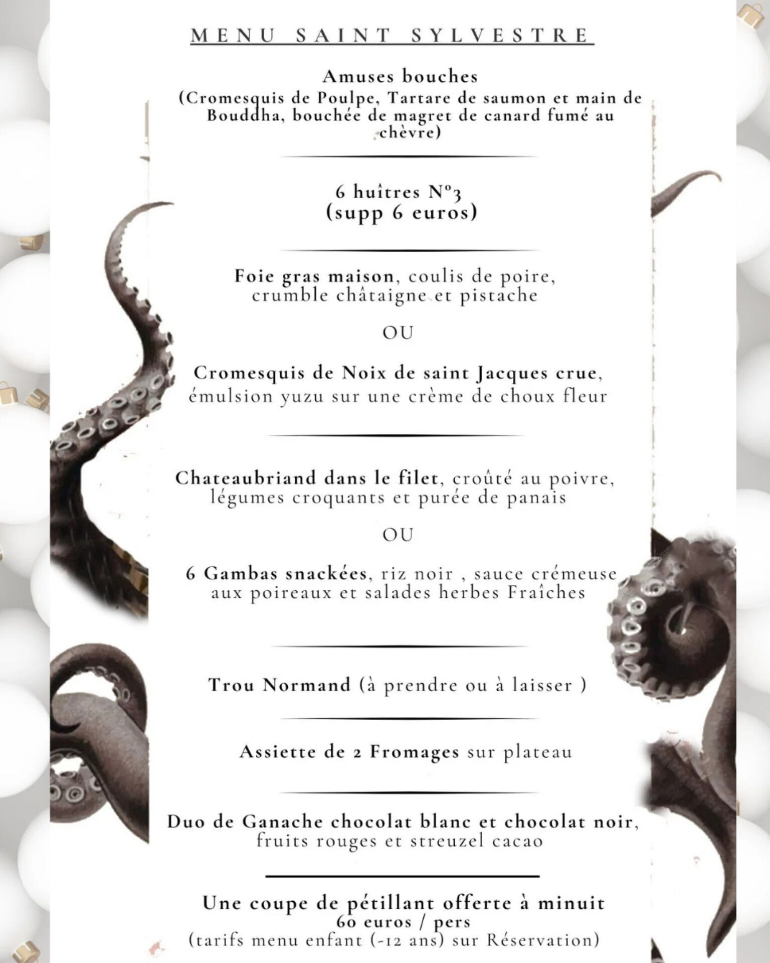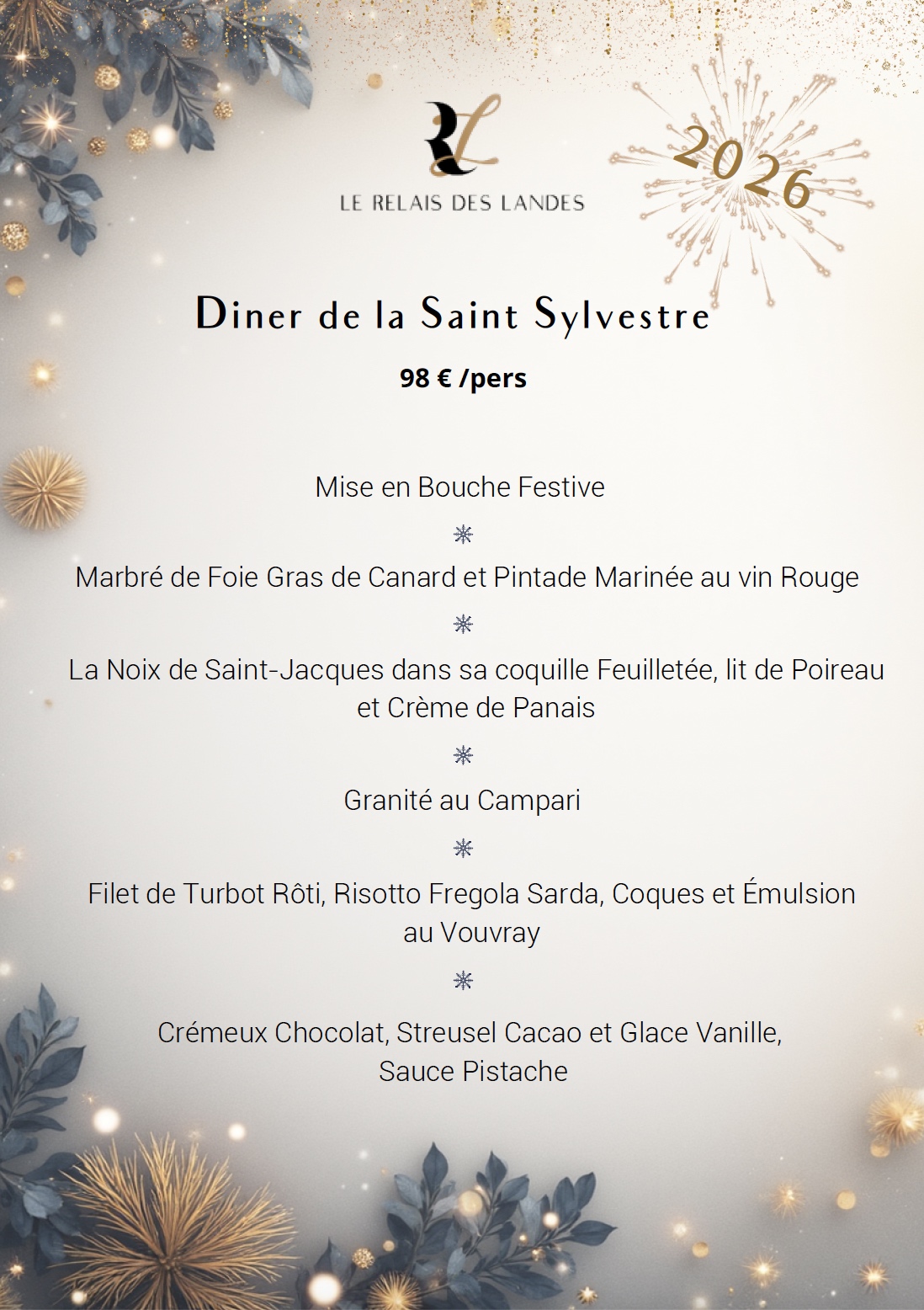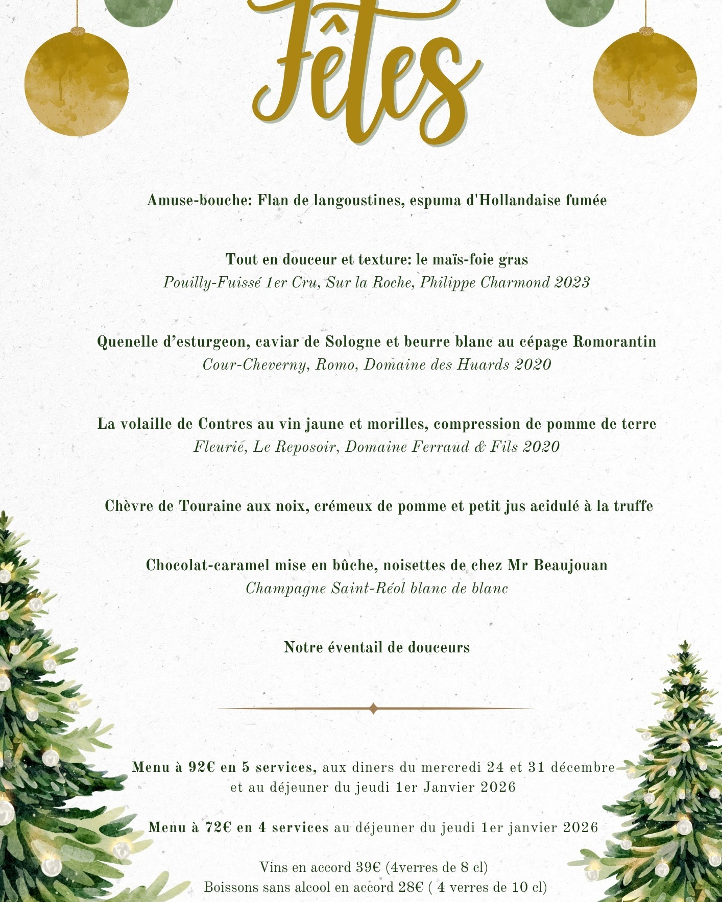 Sa cuisine raffinée, en constante évolution, promet une expérience gourmande unique pour Noël comme pour la Saint-Sylvestre. Pour les fêtes, découvrez des assiettes créatives, des accords soignés et une gastronomie qui impressionnera vos papilles autant que vos convives.